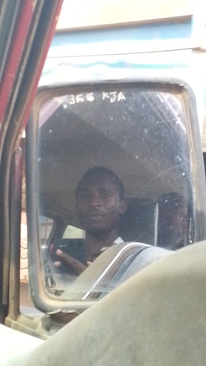 The image depicts a close-up view of a vehicle's driver's side mirror, reflecting a dark-skinned male occupant. The scene is located in Igbo Ukwu, Nigeria. The mirror surface, appearing aged and somewhat obscured by dust or scratches, displays the alphanumeric identifier "355 KJA" across its upper portion. Reflected within the mirror is an adult male with short dark hair and a light beard, wearing a light-colored collared shirt. His right hand is visible within the reflection, holding a dark rectangular object, consistent with a mobile phone. The immediate foreground, out of focus, reveals light-colored interior components of the vehicle, possibly a dashboard or door panel, with a red vertical element visible on the far left, indicating the vehicle's structure. The reflected background beyond the individual is indistinct, suggesting an outdoor environment, with a hazy light-blue horizontal element visible above the mirror frame.