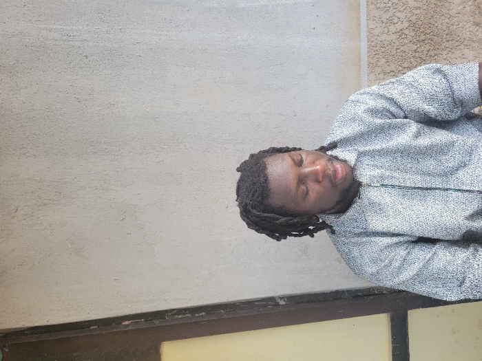 The image depicts a scene in Makurdi, Nigeria. A single adult male subject occupies the lower half of the frame, positioned facing slightly forward with his head tilted downwards and eyes downcast. He has dark skin, a short beard, and black dreadlocks. He is attired in a long-sleeved, collared shirt or jacket, light grey in color with a dark, patterned texture, featuring a full-length zipper down the front. The background consists predominantly of a plain, light grey wall exhibiting a rough or textured surface. To the far left, a dark vertical element consistent with a doorframe is visible, alongside a partial light yellow rectangular section, possibly a door or window pane. The lighting is even and direct.