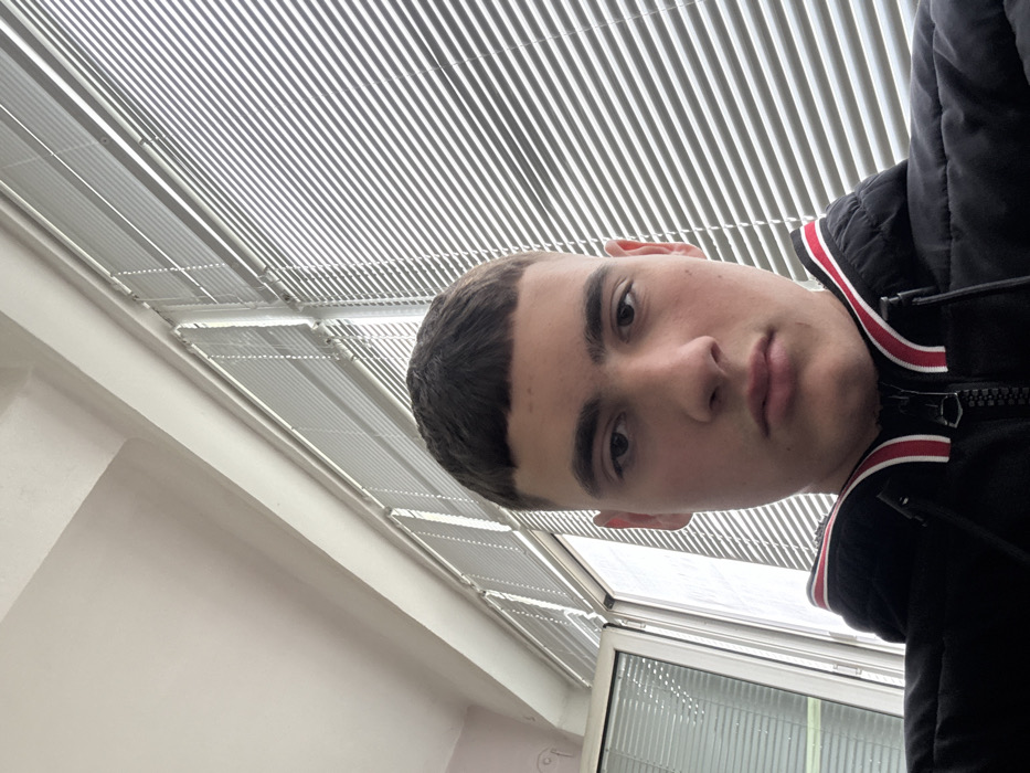 The image displays a young male subject in a close-up, frontal view, looking directly into the camera with a neutral expression. He has short, dark hair styled with a straight fringe, dark eyes, and prominent eyebrows. The subject is wearing a black zippered puffer jacket, which features a red and white striped trim along the inner edge of the collar or hood. No specific actions or interactions are depicted. The background indicates an indoor setting. To the upper left, a white ceiling and a light-colored wall are visible. The right and central background are dominated by a large window equipped with white horizontal Venetian blinds, which are partially closed, filtering natural light into the scene. A portion of a white window frame is visible on the far left. The specific location within the city of Yambol, Bulgaria, cannot be determined from the visual information presented.