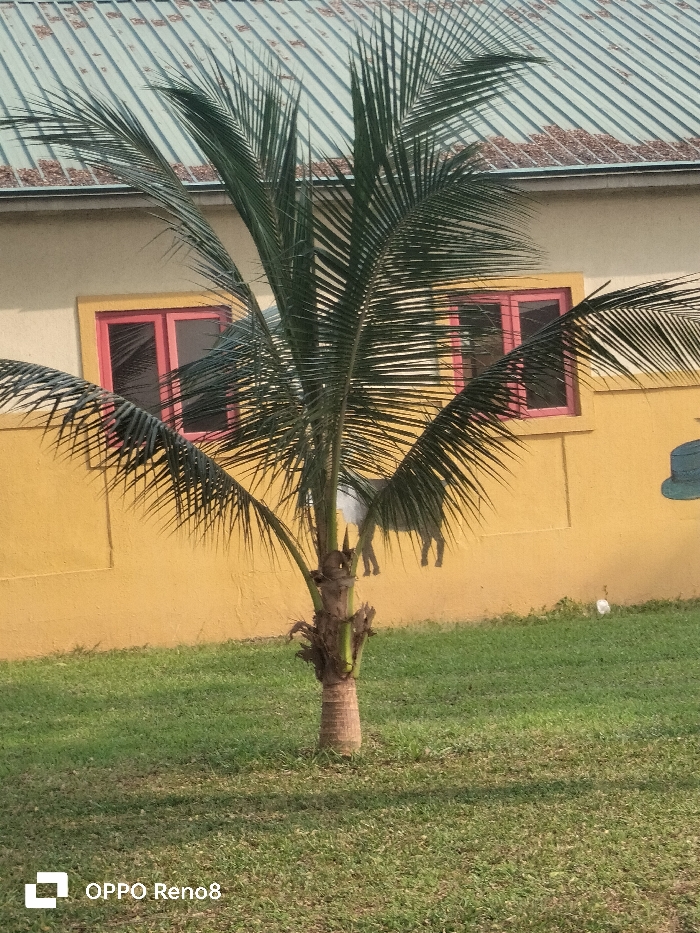 - "The image presents an outdoor scene depicting a young coconut palm tree in the foreground against a single-story building" by FM-Z4Sa13, licensed under CC BY 4.0