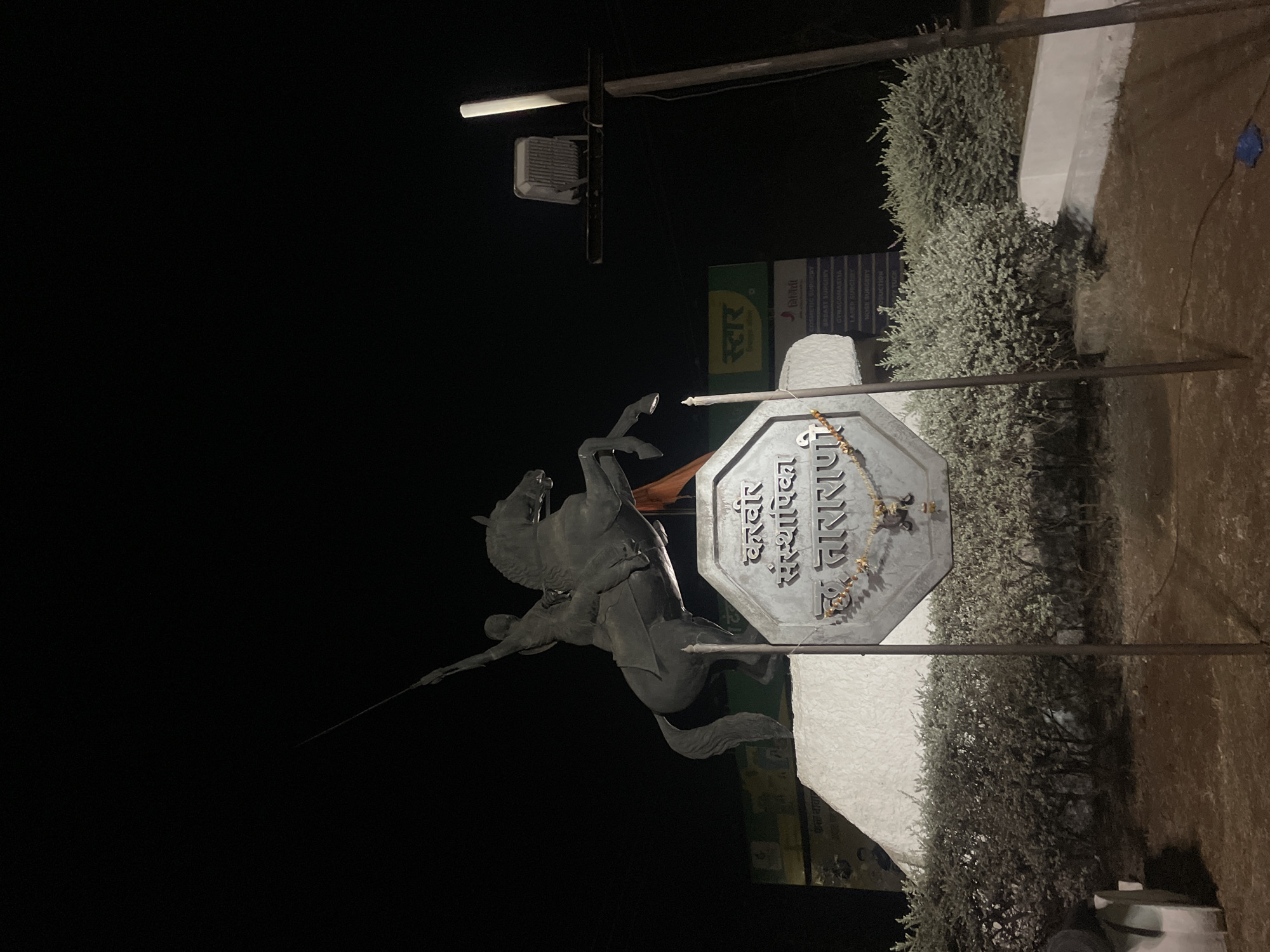 statue of Chhatrapati Shivaji Maharaj on horseback in Kolhapur, India. The statue is positioned in front of a sign, possibly an octagonal shape, with text in the Devanagari script, indicating a name or title associated with the statue or location. The statue and sign are illuminated by streetlights in an otherwise dark environment. The surrounding area includes shrubbery and a pole or vertical supports surrounding the statue. A building or storefront is visible in the background with signage in Devanagari.