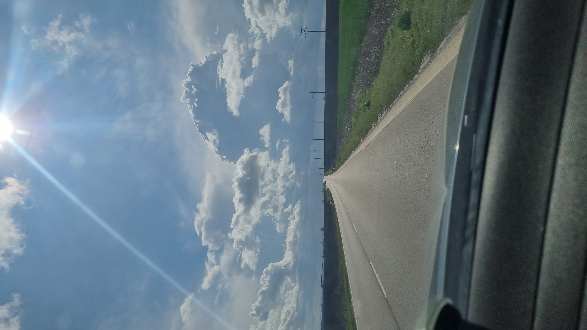 The image depicts a straight two-lane asphalt road viewed from inside a vehicle, looking forward through the windshield. The scene is set in Shtipsko, Bulgaria. The road extends towards a distant horizon, appearing to ascend slightly. On both sides of the road are flat agricultural fields, exhibiting areas of green vegetation and darker, possibly tilled or fallow ground. A series of dark utility poles, supporting what appear to be power lines, runs parallel to the right side of the road. The sky is partly cloudy with large, bright white cumulus clouds distributed across a blue background. The sun is prominently visible in the upper right quadrant of the frame, emitting strong light rays and lens flare. The top of the vehicle's dashboard is visible in the lower portion of the image. No individuals are visible. A single, very distant vehicle can be faintly observed on the road ahead.