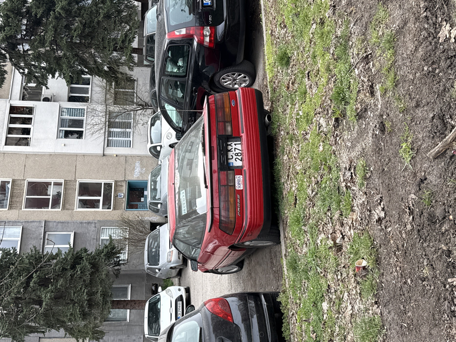The scene depicts an outdoor parking area in Sofia, Bulgaria, situated adjacent to multi-story residential apartment buildings. The foreground features uneven ground composed of sparse grass, exposed soil, and dry leaves. A discarded red and white paper cup rests on the ground towards the left. The midground is occupied by numerous parked vehicles. A red two-door Ford Probe is centrally positioned, viewed from its rear-left aspect. Its Bulgarian license plate reads "C.KX 2871", indicating Sofia registration. A "PROBE" emblem and a "SOPHIA" sticker are affixed to the rear bumper. To the immediate right of the Ford Probe is a black Volvo V50 station wagon, parked facing left. Partially visible on the far left is the rear of a black hatchback. In the background, additional vehicles are parked, including a white Ford Fiesta with Bulgarian license plate "CB 2994 KX", a silver hatchback, a silver sedan, and a white Volkswagen Beetle. The background consists of utilitarian multi-story residential buildings with gray and white facades, featuring various window types, some with external blinds. Evergreen conifer trees are interspersed among the buildings and vehicles. The sky is overcast. No individuals, actions, or interactions are visible.