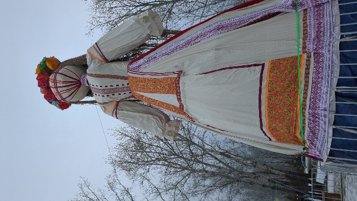 A very tall, anthropomorphic effigy, resembling a woman in traditional attire, stands centrally in an outdoor public space in the city of Unknown, Unknown, viewed from a low angle. The effigy features a spherical, off-white head with radiating red-brown lines, crowned by a vibrant wreath of red, orange, yellow, and green fabric flowers. Long, dark braids extend from the back of the head. It wears a voluminous, long-sleeved, cream-colored gown with gathered cuffs, decorated with vertical red-brown patterned embroidery on the back. The skirt of the gown is embellished with a horizontal band of orange fabric featuring yellow and green motifs, a thin green strip below it, and a lower hem with a purple and white geometric pattern. Vertical red-brown trim outlines sections of the dress, and a wide, patterned red fabric strip hangs vertically down the effigy's left side. The base of the effigy is dark blue and surrounded by silver-colored metal barricades. The background consists of numerous bare deciduous trees against an overcast, light grey sky. Traces of snow or frost are visible on the ground around the effigy. A light-colored vehicle is partially visible in the distant background behind the trees. No human figures are present.