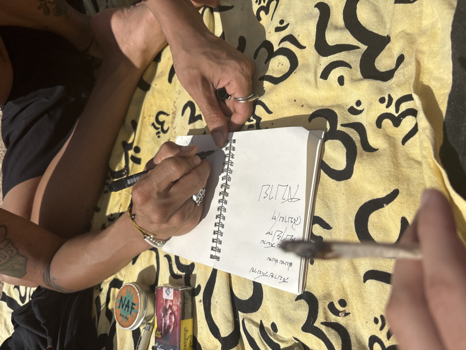 The image depicts an outdoor scene in ตำบล เกาะเต่า, Thailand, under direct sunlight. A person is seated on a yellow fabric mat patterned with black "Om" symbols, with their bare legs and forearms visible. This individual is wearing black shorts. Their left hand, adorned with a beaded bracelet and a silver Hamsa ring on the ring finger, steadies an open, white, spiral-bound notebook. Their right hand holds a black pen, actively writing in Thai script on the page. The word "สบาย" (sabai) is distinctly visible multiple times on the page. To the left of the notebook, a metallic tin with a green leaf logo and "NAF" text, along with a cigarette pack displaying Thai script and a small metallic object, rest on the yellow mat. In the blurred lower foreground, the fingers of a second individual hold a lit, hand-rolled joint.