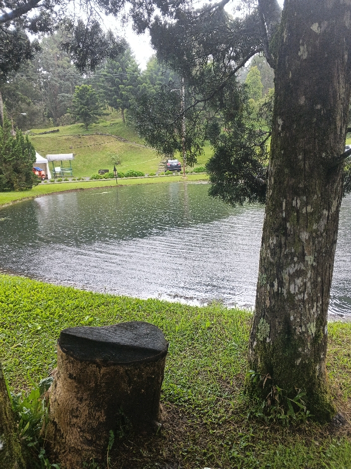 The scene depicts a wet, overcast outdoor environment in Matopos, Zimbabwe. In the immediate foreground, to the right, is the moss-covered trunk of a large tree. To the left, a dark-topped tree stump rests on wet, vibrant green grass that extends to the edge of a body of water. The water, a muted greenish-blue, occupies the midground, its surface covered uniformly with small ripples, indicative of rainfall. Across the water, a narrow strip of wet green grass runs parallel to the bank. Situated on this far bank, from left to right, are a white tent-like structure with a red object nearby, followed by a white canopy structure sheltering two green benches. Further to the right, a dark-colored sedan or SUV is parked near the water's edge. Beyond the far bank, the terrain ascends into hills densely covered with evergreen trees, appearing somewhat misty under an overcast sky. No individuals or specific actions are visible.