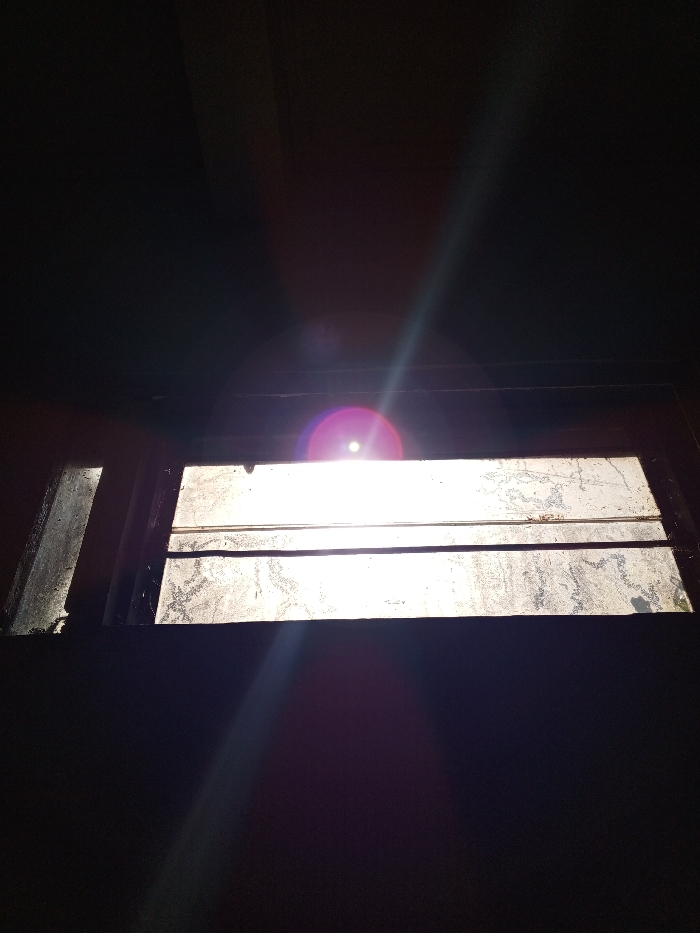 The image depicts an interior scene located in Bayawan, Philippines. A rectangular window, framed in dark material, occupies the central mid-ground, serving as the primary light source. The window panes are obscured by a mottled, textured layer, consistent with dirt or dried residue. Intense, direct sunlight emanates from the window, causing severe overexposure within the window area and producing distinct lens flare, visible as a prominent magenta and white circular artifact centrally positioned within the light and accompanied by diagonal blue-white light streaks extending across the frame. The surrounding interior environment is dark and underexposed, rendering specific details indistinguishable beyond vague structural outlines of an upper wall/ceiling and a lower wall/sill. No individuals, animals, specific objects, or actions are depicted within the frame.
