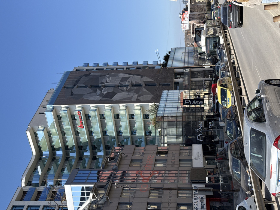 This image depicts an urban street scene on "Bulgaria" Boulevard in Sofia, Bulgaria, characterized by a mix of modern commercial and residential buildings under a clear blue sky