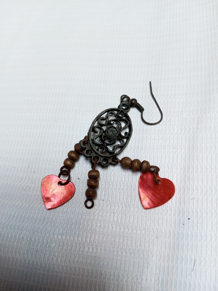 A single, dark bronze-toned dangle earring is presented against a plain white, subtly textured background. The earring consists of a shepherd's hook earwire attached to an oval-shaped filigree component, which features intricate scrollwork and a central flower-like motif. Suspended from this central piece are two descending strands, each composed of three small, spherical brown wooden beads, terminating in a flattened, heart-shaped charm. These heart charms display a reddish-orange hue with slight iridescent reflections and surface imperfections. A third, shorter strand of two wooden beads hangs centrally below the filigree component, ending in a closed jump ring. The scene depicts a static object in a studio-like setting, and there are no visual cues within the image to suggest a specific external location in Ciherang, Indonesia.