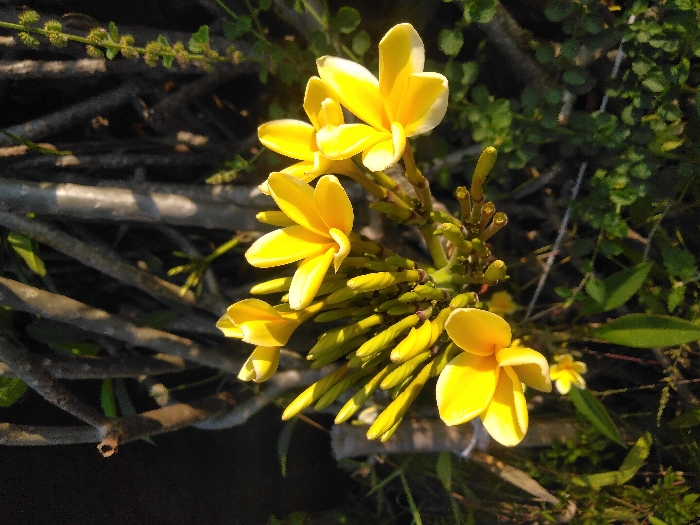 - "The image displays a close-up view of bright yellow Plumeria flowers and numerous buds on a branch, located in the city of El Nayar, Mexico" by FM-U14g83, licensed under CC BY 4.0
