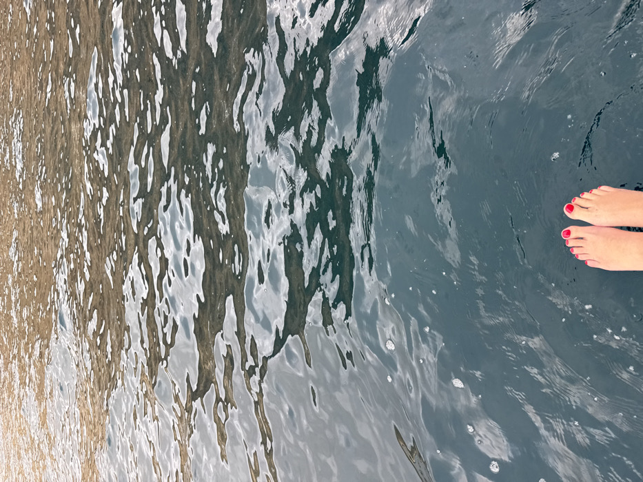 Water fills the frame, reflecting light in a dynamic pattern. The right side of the image displays a deeper, more uniform blue, punctuated by bubbles and two feet. Bright red nail polish adorns the toes. The water to the left is more agitated, with varied shades of gray and brown creating a complex, textured surface. Light plays across the ripples, resulting in an abstract representation of water in motion.