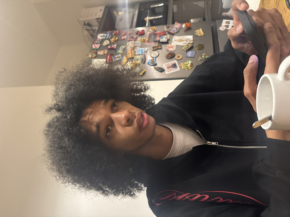 The image captures an individual seated indoors within a domestic setting in Saint-Denis, France. A single person, appearing male, is visible from the chest up, possessing dark, voluminous curly hair and a medium complexion. The individual is wearing a black zippered hoodie with a red cursive design on the viewer's left side, over a light-colored undershirt. Their gaze is directed off-camera to the viewer's right, with their mouth slightly ajar. Their left hand, centrally positioned, holds a dark-colored smartphone, with fingers actively interacting with its illuminated screen. A white ceramic mug containing a silver spoon is located on a light-colored surface in front of the individual's right hand. In the background, to the right of the individual, a silver-colored refrigerator is heavily adorned with numerous diverse magnets. Above and to the right of the refrigerator, a shelving unit holds several items. The scene is illuminated by an indoor artificial light source.