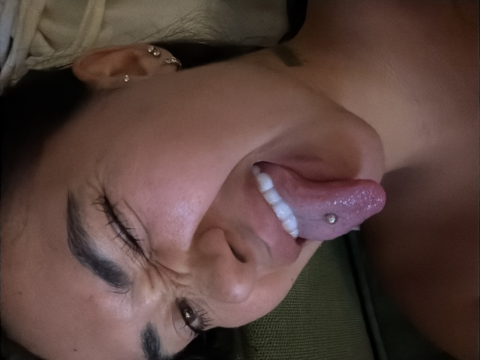 The image displays a close-up, angled view of an individual's face, identified as a young adult female, situated in Tibubeneng, Indonesia. The background is dark and out-of-focus, indicating an indoor setting with soft, ambient lighting. A dark green fabric is partially visible on the left, and a lighter, possibly off-white, soft surface is present on the right. The individual is engaged in an exaggerated facial expression: both eyes are squinted, creating prominent wrinkles around the outer corners and the bridge of the nose. Her mouth is open, and a pink tongue is extended outwards. A metallic barbell piercing is clearly visible through the center of the extended tongue. The upper teeth are visible and appear clean. The individual's visible left ear (viewer's right) features multiple piercings: a small stud in the helix, two studs in the lobe, and a small hoop in the lower lobe. Dark eyebrows are well-defined, and dark hair is visible around the periphery of the face.