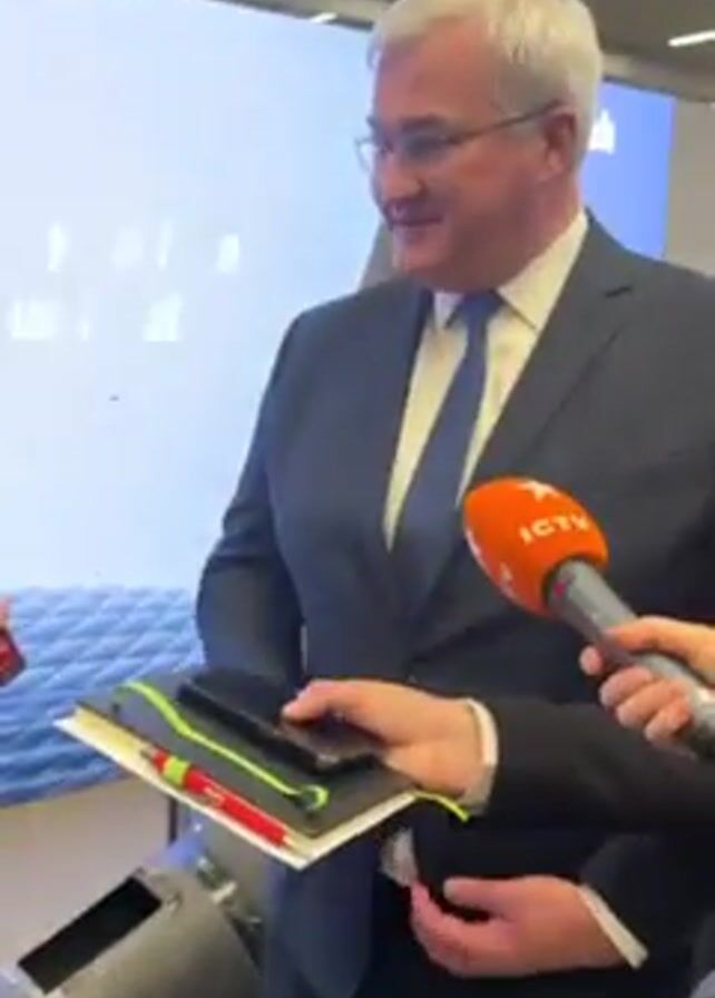 man in a navy blue suit and blue tie being interviewed by two reporters. He has short grey hair and is wearing glasses. The reporters are holding microphones with the logos of ICTV and radio Svoboda. The man is holding a notebook and a pen in his left hand. In the background, there is a display with the words "country would not be able Russian attack," and "2024, 2025." A partially obscured object resembling a piece of machinery is visible. The man appears to be smiling and engaged in a conversation with the reporters.