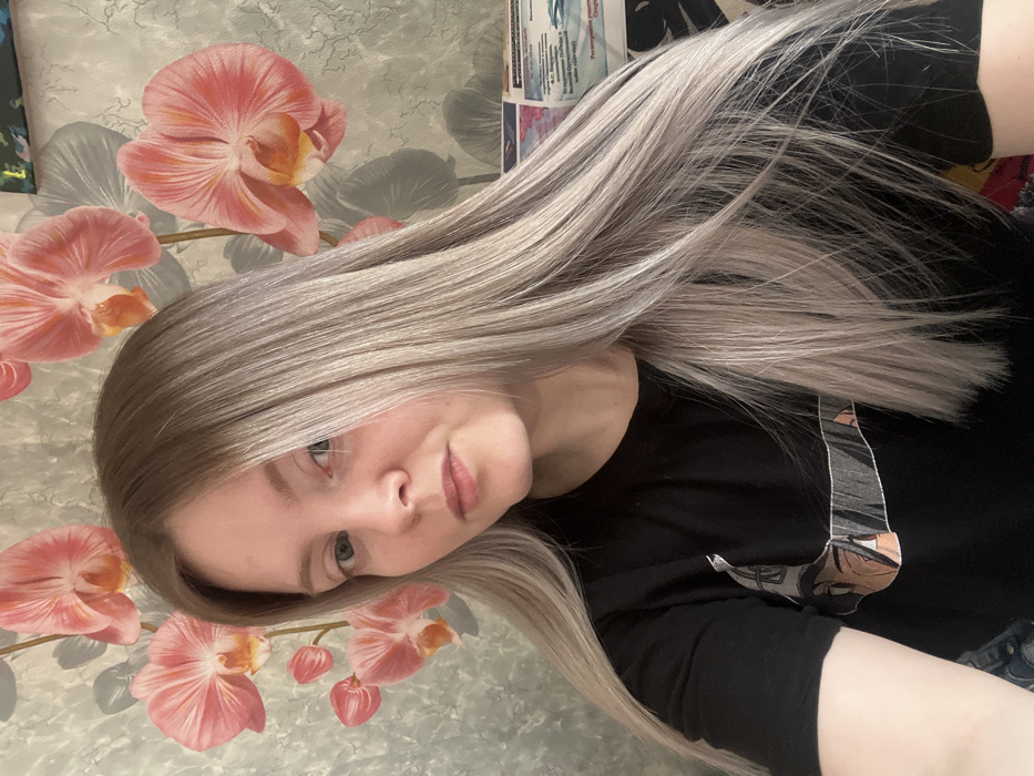 An interior scene located in Дойная, Russia, features a young adult female positioned centrally, facing the viewer with a neutral expression. She has long, straight, ash-blonde hair with visible darker roots, parted on the left. She wears a black short-sleeved t-shirt featuring a partial graphic print, depicting what appears to be an anime character's face in shades of black, brown, and white, across the chest. The background wall is covered with wallpaper displaying large pink orchid blossoms with yellow centers, against a textured light grey and green leaf pattern. On the right side of the background, an abstract artwork with green and blue tones is partially visible, alongside several stacked documents on an unseen surface. One prominent document is light blue and white, containing Cyrillic text, including the word 'Регистрация' (Registration), consistent with an official Russian form.
