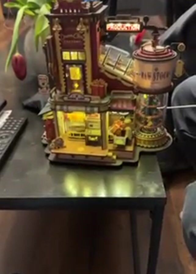 A close-up video shows a person seated near a dark gray table. On the table, there is a model of a factory building that is lit up and appears to be made of wood. The model includes elements like "Raw Stock" on a cylindrical tank and "Dream Factory" on the main building. A remote control is visible to the left of the model. A plant with tulip-like flowers is in the background. The person seems to be interacting with the model, possibly triggering the lights and/or the music playing in the video. The background includes a water bottle and what looks like a dark textured couch or blanket.