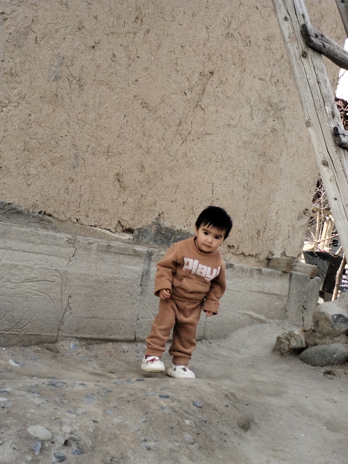 A young child stands on an uneven dirt and gravel surface in Limbur, Uzbekistan
