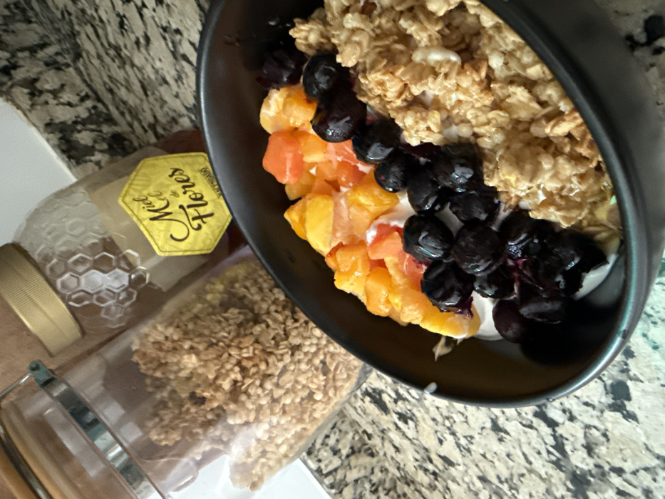 An overhead view depicts a black serving bowl resting on a light speckled countertop in an indoor setting, likely a kitchen in Burjassot, Spain. The bowl contains a creamy white base topped with three distinct sections: diced orange fruit (e.g., mango or papaya), dark blue berries (e.g., blueberries), and light brown granola. A viscous, golden liquid, consistent with honey, is visibly drizzled over the granola and some berries. In the blurred background, two additional items are present: a tall, clear glass jar with a wooden lid, filled with granola, and a smaller, clear glass jar with a honeycomb texture and a golden lid. This second jar features a yellow label with black script reading "Miel de Flores" and "HACENDADO," identifying it as flower honey from the Hacendado brand. No individuals are visible in the scene.