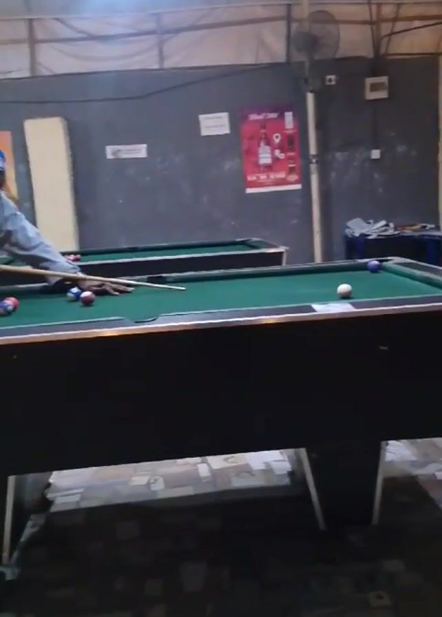A person wearing a blue baseball cap and light grey shirt, is playing pool at a bar. They are lining up a shot at a pool table covered with balls. Another person in a white patterned shirt walks by the camera. There is another pool table in the background, and posters on the wall behind them. The room has bright, fluorescent lighting.