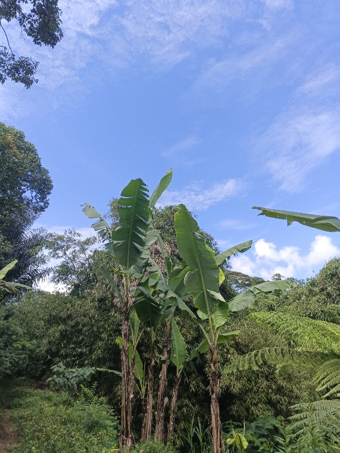 A vibrant landscape displays lush greenery under a bright, partly cloudy sky. Banana trees with broad, verdant leaves stand tall in the foreground. Dense foliage, including ferns and various trees, creates a backdrop of varying shades of green. The scene evokes a tropical environment, with the clear sky contrasting with the abundance of vegetation.