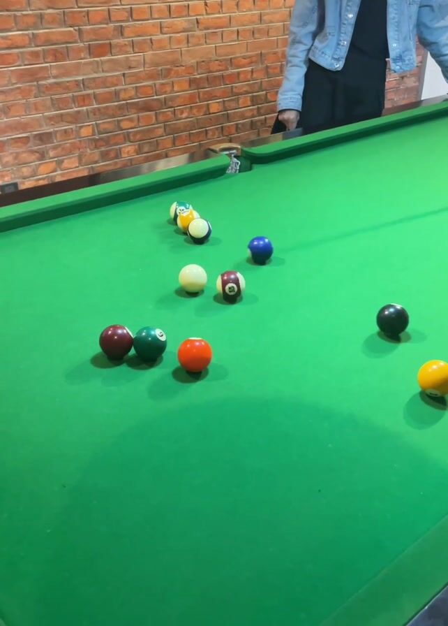 A person in a blue denim jacket plays pool. The pool table is green and has a set of multi-colored balls scattered on the surface. A brick wall is in the background. After the first shot, the person leans on the table and watches the balls roll.