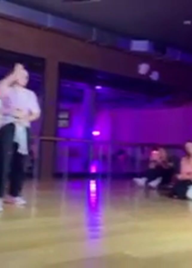A dance class performance is underway in a dance studio with hardwood floors