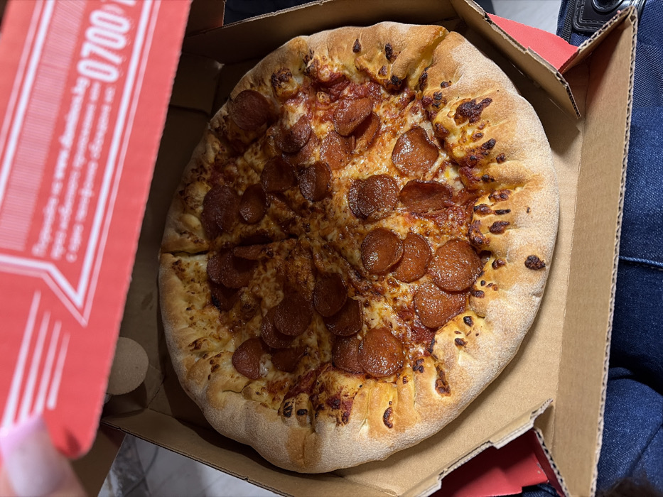 - "A large, circular pepperoni pizza, baked with a golden-brown crust, melted cheese, and tomato sauce, is presented in an open, brown cardboard Domino's Pizza box" by FM-FEO493, licensed under CC BY 4.0