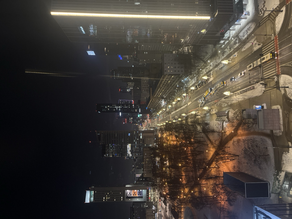 An aerial shot of a city at night. Skyscrapers illuminate the sky, while street lights line the roads below. Bare trees stand in a snow-covered park, shadows cast by the lights. Cars and a tram travel along a snow covered street, adding movement to the scene. A blurred line across the night sky is visible.