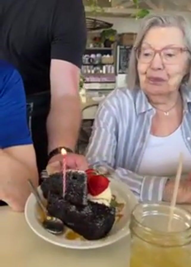 A woman sitting at a counter receives a small birthday cake from a waiter. The cake is a square of dark chocolate cake with a single lit candle, dusted with powdered sugar and topped with a strawberry and a dollop of whipped cream. The woman is wearing a white shirt and a blue and white striped button-down. She has short gray hair and glasses. There is a jar of yellow liquid and a slice of lemon on the counter in front of her. A man in a black shirt and apron is holding the cake in front of her. Another person is wearing a blue shirt. Other patrons are visible in the background of the bright, airy cafe. The woman smiles widely as the cake is presented. Someone sings "Happy Birthday".