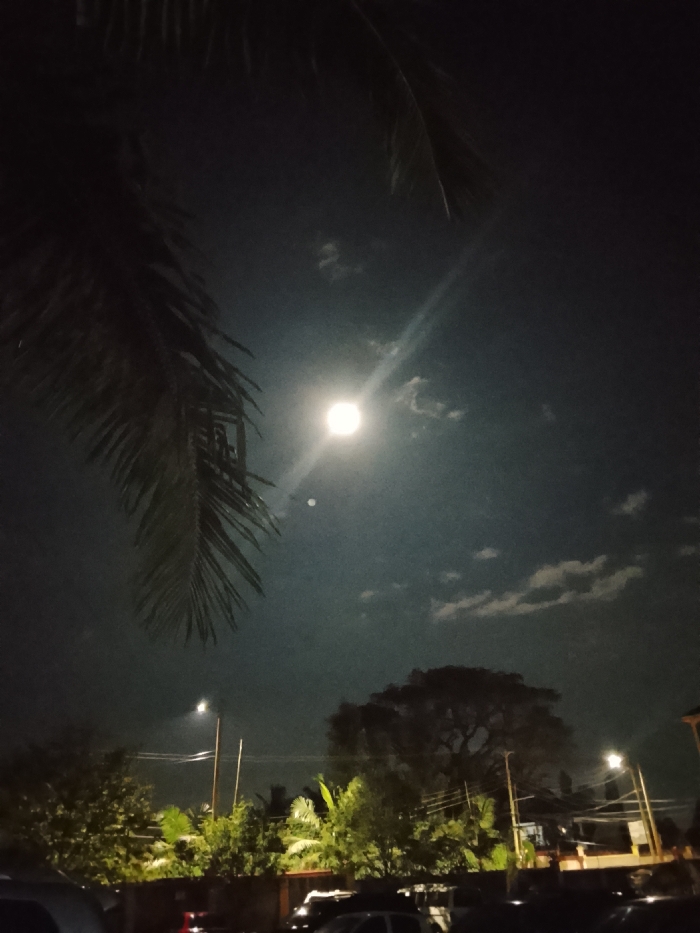 The image depicts a nighttime scene in Kiambu Township ward, Kenya. A prominent, bright full moon, accompanied by a distinct lens flare and a smaller, fainter light source, illuminates the upper sky, which contains scattered white clouds. A large, dark palm frond extends diagonally from the upper left into the frame, partially obscuring the sky. Below the horizon line, dense green foliage and trees are visible, illuminated by several operating streetlights that also reveal overhead power lines spanning across the midground. A large, dark tree stands in the mid-distance. The lower portion of the image shows the dark tops of multiple parked vehicles.