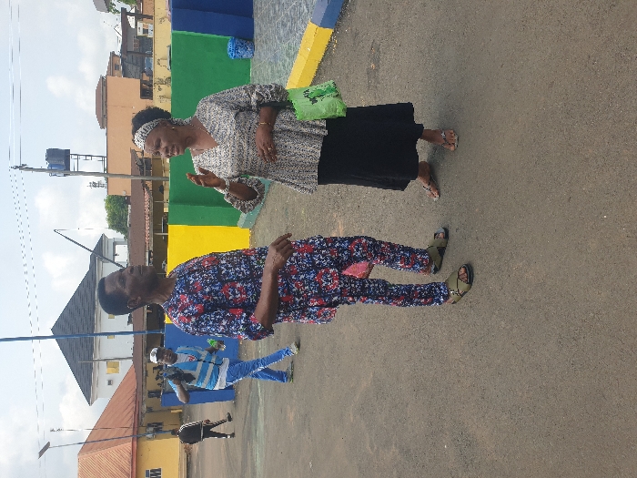 The image depicts an outdoor scene in Umuahia, Nigeria, likely a paved area or street, with multiple individuals and urban structures under a partly cloudy sky