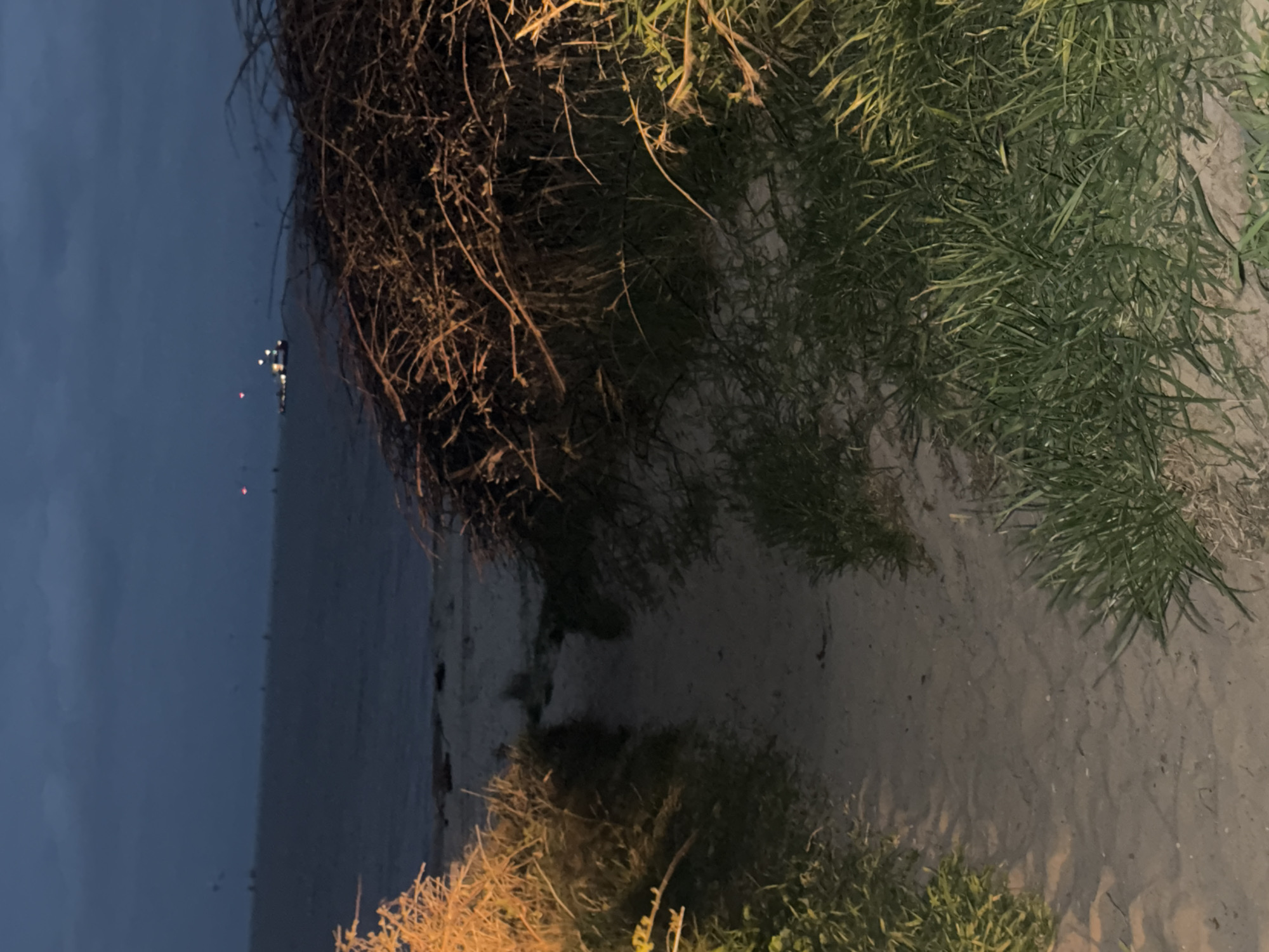 A sandy pedestrian path in Caister-on-Sea, United Kingdom, is depicted at night, leading from the foreground towards a dark beach and the North Sea under an overcast, dark blue-grey sky. The path is flanked by patches of green grass and dense, thorny scrub, with vegetation on both the left and right exhibiting an orange-yellow artificial illumination. The path opens onto a wider expanse of sand before meeting the dark water. In the distant mid-ground on the water, a vessel with discernible white and red lights is visible, accompanied by several other scattered artificial lights on the horizon. No individuals are present within the scene.