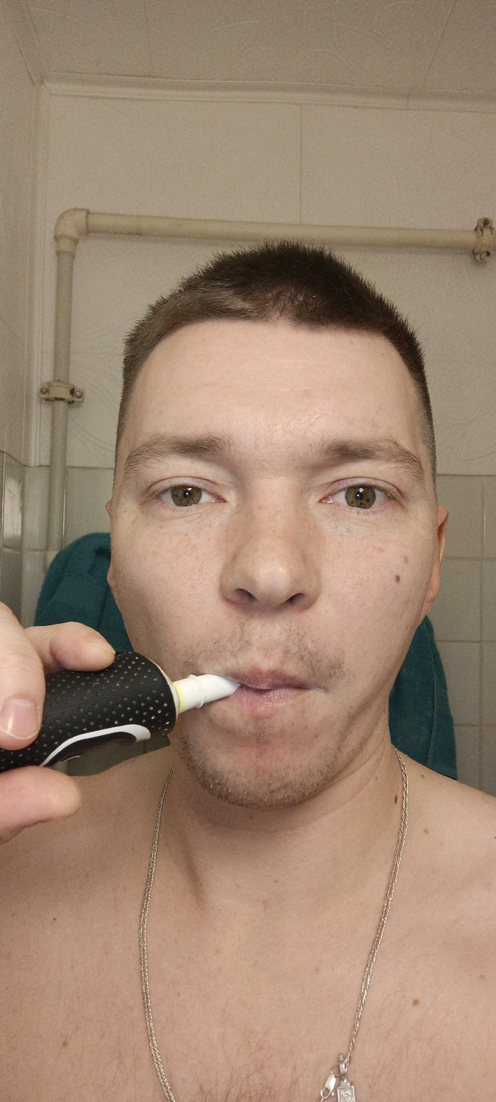 A man with short brown hair is brushing his teeth. He's holding a black and white electric toothbrush to his mouth. His skin is light, and he has light-colored eyes. He's wearing a silver chain necklace. The background is a bathroom with white tiled walls and a white pipe. A blue towel is visible behind him. He appears to be shirtless.