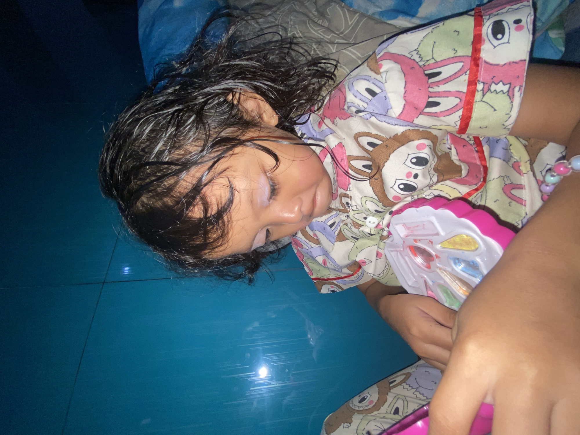 A young child is lying on a blue tiled floor, potentially in a house in Gelam, Indonesia. The child is on their side, wearing pajamas with a cartoon animal pattern. The child's dark, wet hair is spread around their head. They are holding a pink and white toy. A patterned blanket is nearby.