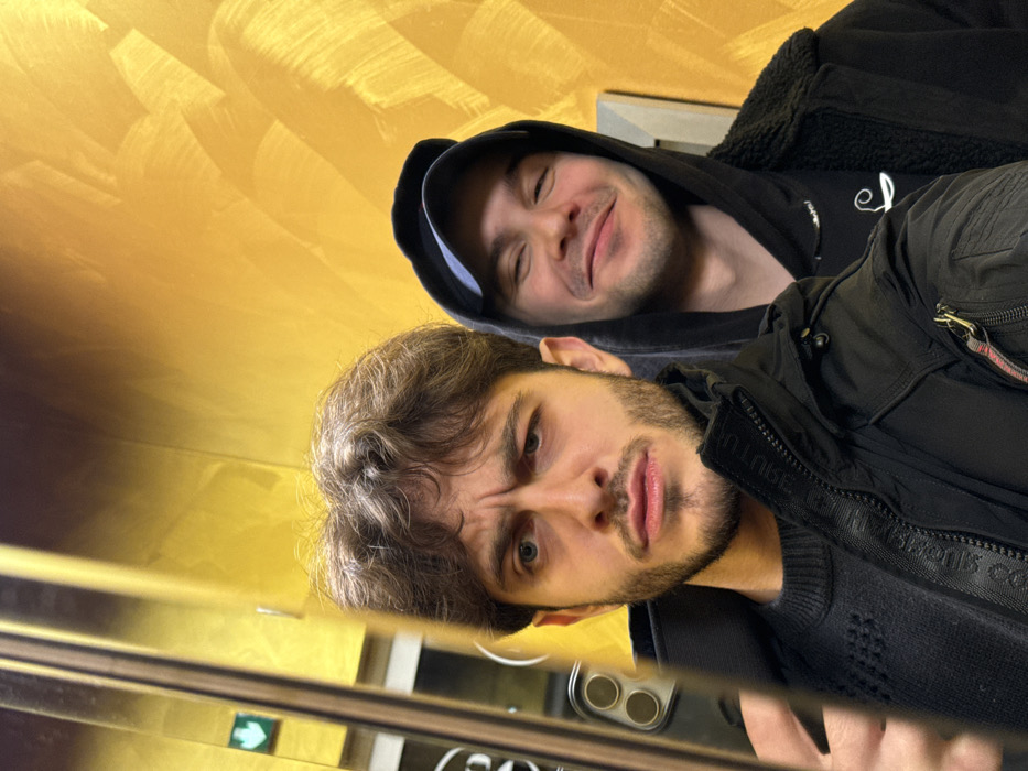 Two young men pose for a selfie in what appears to be an elevator with gold-colored walls. The man closest to the camera has brown hair and a trimmed beard, wearing a dark jacket over a black sweater. His brow is furrowed. The second man, slightly behind, wears a black hoodie and looks more relaxed with a gentle smile. The lighting is somewhat warm.