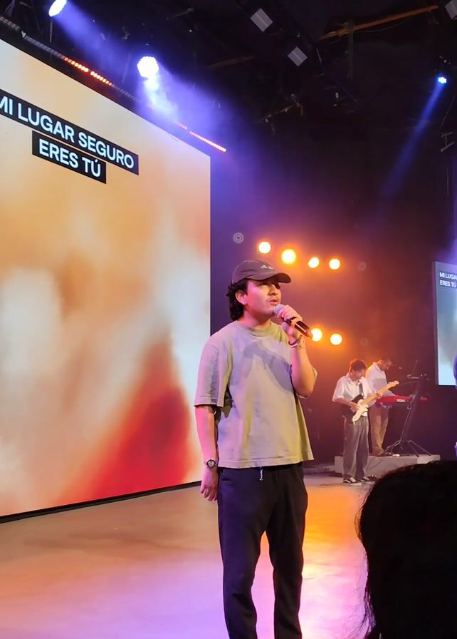 live music performance. A male singer, wearing a light green t-shirt, black pants, and a dark-colored cap, stands center stage holding a microphone. Behind him, a large screen displays the words "MI LUGAR SEGURO ERES TU," which translates to "YOU ARE MY SAFE PLACE." To the right of the singer, another male singer in a black shirt and jeans raises his arms while singing. To the left, band members play instruments including an electric guitar and keyboard. Stage lighting illuminates the performance with a mix of orange, yellow, and blue hues. The perspective of the video suggests it was recorded by an audience member. The back of someone's head is visible in the foreground.