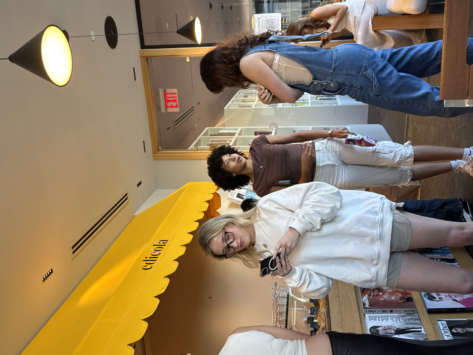 This image depicts the interior of a commercial establishment identified by a yellow awning bearing the text "edicola," located in Miami, United States. The scene captures several individuals engaged in various activities. In the center-left, a blonde female wearing glasses, a cream-colored sweatshirt, and light shorts is actively focused on a black smartphone held in both hands. To her right, a female with dark, curly hair, dressed in a brown fitted t-shirt and white capri cargo pants, looks towards the right, holding a small purple object in her left hand. Adjacent to her on the right, a female with long, wavy reddish-brown hair wears blue denim overalls over a white top, standing with her hands clasped in front. A partial view of an individual wearing a white tank top and dark pants is visible on the far left. In the background right, a female with lighter hair, wearing a light-colored dress, is seated and also viewing a smartphone. Below the "edicola" awning, a glass display case contains assorted baked goods. A magazine rack displaying various publications, including "Perfect" and "W Magazine," is positioned in the immediate foreground. The ceiling is white, featuring modern recessed lighting and air conditioning vents, from which two dark, conical pendant lights hang. A red illuminated "EXIT" sign is visible above a glass door in the background, which opens to a space lined with bookshelves. The interior is brightly lit, suggesting a modern cafe, newsstand, or bookstore environment.