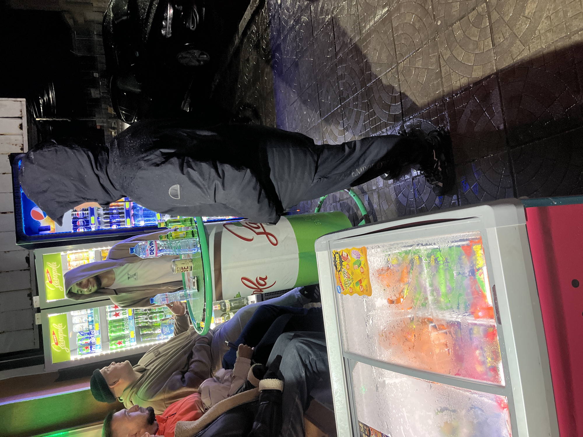 The image portrays an outdoor nighttime scene in Meshtitsa, Bulgaria, distinguished by wet ground and artificial illumination. Four individuals are present. Three males are positioned around a circular, green-topped table with a cylindrical base featuring "Загорка" branding. One male, seated, has a beard and wears a red top and a light-colored, possibly fur-lined, jacket. Another seated male wears a black beanie and a khaki hooded sweatshirt, facing a third male. This third male, with a beard, wears a light brown hooded sweatshirt with its hood up over a white t-shirt featuring a black 'X' logo, and is smiling while facing the man in the beanie. A fourth person, partially visible, is seated and wears dark jeans and a light pink top under a dark jacket. The table holds several plastic water bottles, smaller green bottles, and a metal can. Behind the group, two upright beverage coolers with green illuminated "пиво Загорка" branding display various canned and bottled beverages, including Heineken. To the right of these, another upright cooler with blue illumination contains Pepsi products and water bottles. In the foreground, a white chest freezer with a clear, condensation-covered lid holds colorful packaged items. A price list or menu for "Ice cream" is attached to the lid. To the right of the table, facing away from the camera, stands a person wearing a black hooded jacket with visible water droplets and black pants; an arched logo is present on the left sleeve. The ground is covered with wet, dark-patterned paving tiles, reflecting light. A green hose is visible coiled near the table's base. In the dark background to the right, a black vehicle (car/SUV) is partially visible, also appearing wet.