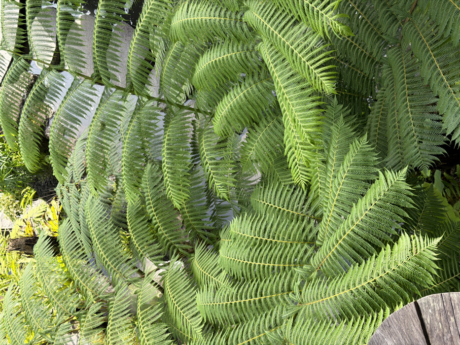 Lush, green ferns dominate the view, their feathery fronds overlapping