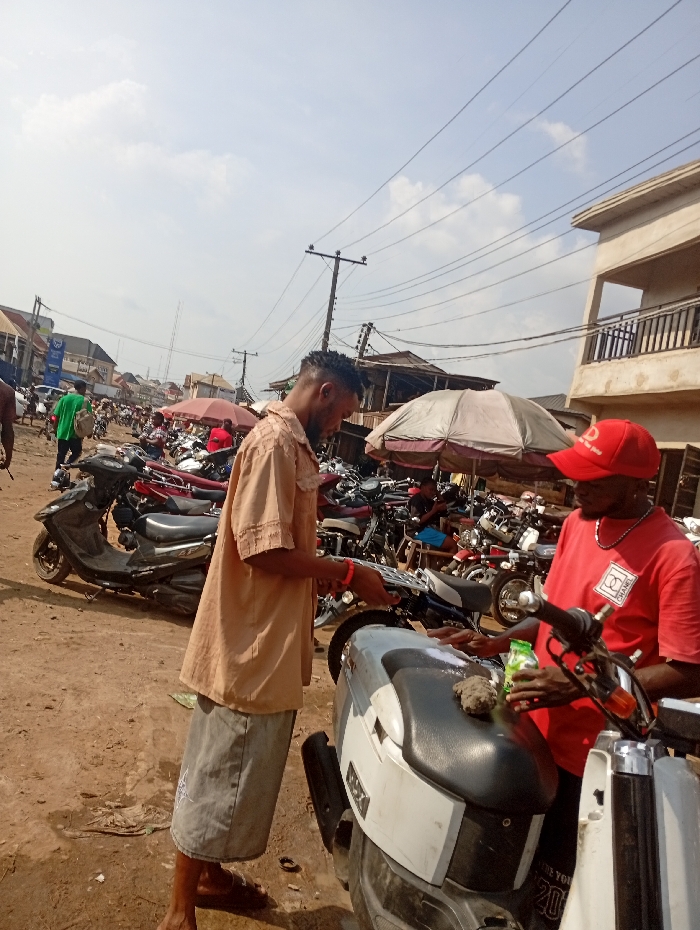 - "The image depicts an outdoor scene in Nnewi, Nigeria, characterized by a bustling motorcycle market or parking area under a bright, partly cloudy sky" by FM-gopco1, licensed under CC BY 4.0