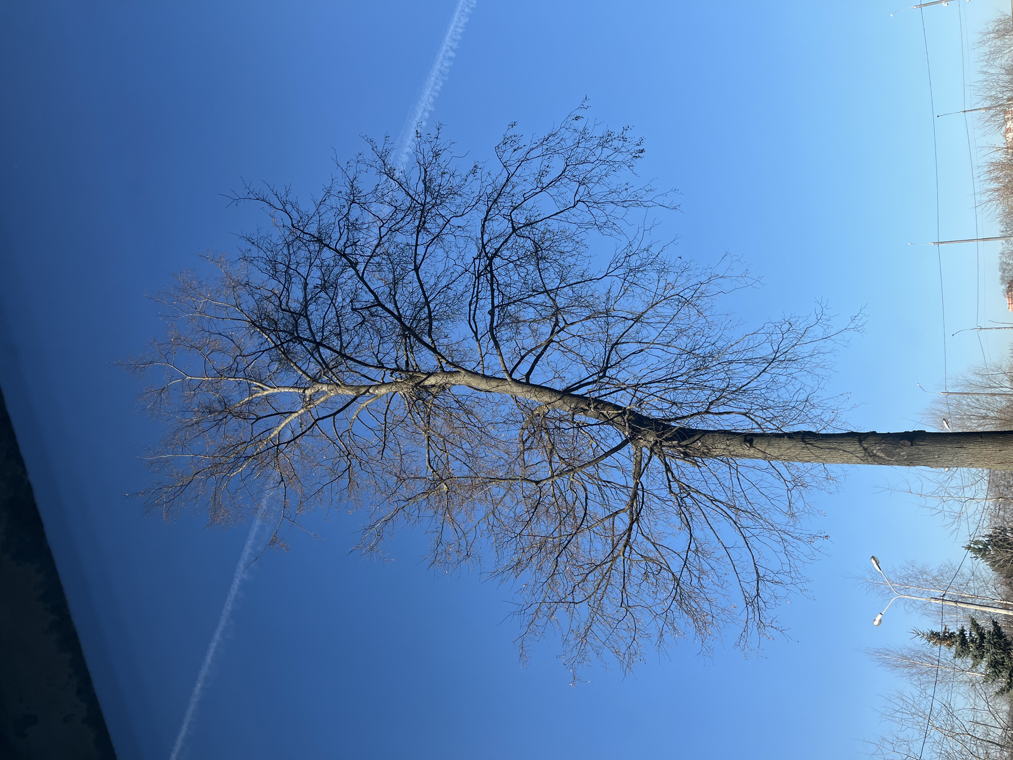large, leafless tree against a bright blue sky. The trunk of the tree extends horizontally across the lower half of the frame, with its branches reaching upwards and outwards. A contrail stretches across the upper left portion of the sky. In the distance on the right side, utility poles and the tops of other trees are visible. It is a sunny day. While the image might depict a scene similar to locations in Podolsk, Russia, this is beyond the scope of image data.