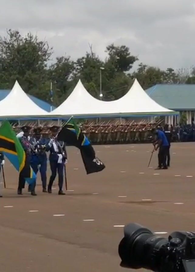 The video depicts a military parade taking place on a large, open field. A uniformed military unit is marching in formation towards the camera, carrying the flags of Tanzania. The unit is passing by a row of white tents. Behind the unit is another group of uniformed people standing in formation. There is a camera on a tripod in the foreground, a speaker system to the left, and a cell tower in the background. The sky is overcast. A man is standing near the marching unit holding a cane.