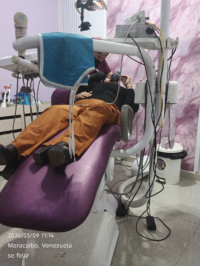 The image depicts an interior scene, identified by an overlay as Maracaibo, Venezuela. A dental procedure is in progress within what appears to be a dental clinic. A patient is reclined on a purple, padded dental chair, positioned centrally. This individual wears a black long-sleeved top, orange pants, and dark shoes. A gold-colored bracelet and ring are visible on their left hand. A dental professional, wearing a dark top, yellow-tinted safety glasses, and black gloves, leans over the patient's head, actively performing a procedure on the patient's mouth using dental instruments. A complex dental unit with multiple arms, hoses, and wires is positioned around the chair. A blue protective drape hangs from one of the unit's arms, extending over the patient's upper torso. A control panel with various dials is mounted on the unit. Wires and hoses descend to the floor, where a white waste bin with a black lid and a biohazard symbol is visible. A white cabinet or counter with assorted dental supplies is partially visible on the left. The walls are covered in a light purple, marble-patterned finish. The timestamp "2026/03/09 11:14" is present in the lower-left corner.