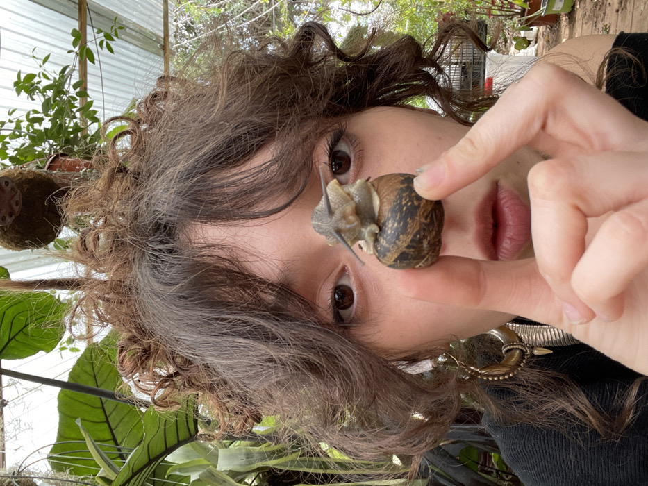 An individual, likely female, with light brown, curly hair and bangs, is positioned in a close-up, eye-level shot, partially obscuring her face. She has brown eyes looking directly at the camera. Her right hand, with fingers extended, holds a large land snail between her thumb and forefinger, positioned centrally in front of her face, obscuring the area from her nose downwards. A smaller snail is visible on top of the larger snail's shell. The larger snail displays a dark brown and striped shell pattern with its body and extended antennae visible. The individual wears a dark-colored garment and a large, ornate, gold-toned hoop earring on her left ear, featuring a textured surface and a pointed drop accent. The scene is set within a greenhouse or covered garden environment, indicated by translucent corrugated roof panels visible overhead, allowing diffused natural light. The background features various green plants, including large-leafed tropical-appearing foliage on the left and thinner vines on the right. A moss-covered hanging planter is suspended from the roof structure in the upper center. Potted plants are visible on the ground to the right. A wire cage or trellis structure is partially visible behind the plants on the right. The specific location within the city of Pardes Hana-Karkur, Israel, cannot be determined from the visual evidence provided.