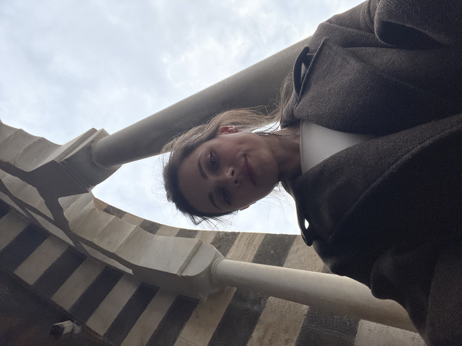 A lone female subject is captured in a low-angle selfie, positioned centrally and looking directly into the camera. She wears a dark brown, textured overcoat over a white inner garment, with her dark hair loosely pulled back. Her expression is a slight smile, revealing dimples on her cheeks. The background features architectural elements characteristic of Pogerola, Italy, comprising a series of stone arches and supporting columns. These structures exhibit distinctive alternating horizontal bands of dark and light stone. A cloudy, overcast sky is visible through the arch openings, indicating an outdoor or semi-enclosed setting within a historical building or portico.