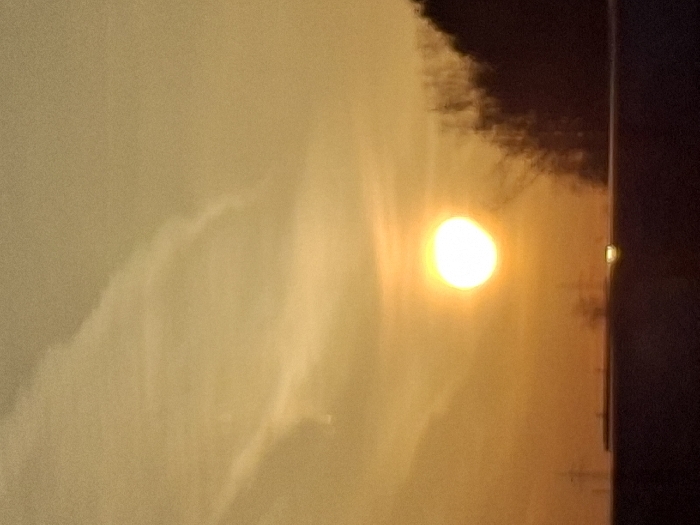 The scene is set in the city of Luxembourg, Luxembourg, and captures a sunset or sunrise over a largely indistinct landscape. The sky, bathed in warm orange and yellow tones, features a prominent, brilliant white-yellow sun positioned slightly above the central horizontal axis. Wispy, diffuse clouds are discernible in the upper portions of the sky. The lower third of the image is dominated by a dark, horizontal band, which may represent a distant landform, road barrier, or elevated structure. To the left, several faint, dark vertical structures, consistent with utility poles or towers, are silhouetted. To the right, a dark, blurry mass of silhouetted trees or dense vegetation rises from the horizon. A small, distinct bright reflection or light source is visible on the dark horizontal band near the image's bottom center. No individuals, specific vehicles, or discernible activities are depicted. The overall image exhibits some blur and graininess.