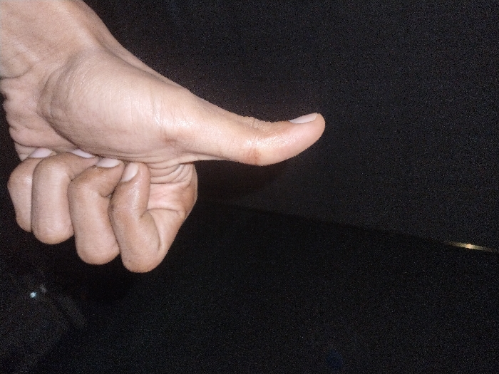 A human right hand is depicted against a dark, textured background, positioned in Kutaglumpang, Indonesia. The hand's skin tone is medium-brown. The thumb is extended horizontally, pointing towards the right side of the frame. The remaining four fingers are curled inward, forming a loose fist, with their tips positioned below the palm and thumb. The hand appears to rest on or be positioned above a subtly reflective dark surface, evidenced by a faint horizontal light reflection visible in the lower right quadrant of the frame. No other individuals or distinguishing objects are present in the immediate vicinity.