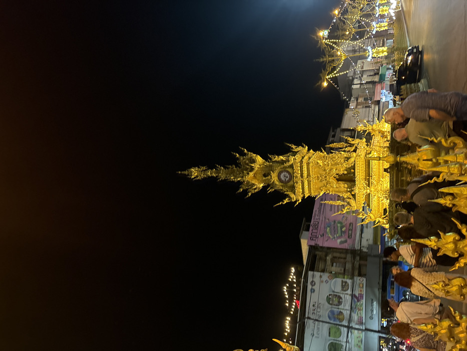 The image displays the illuminated Golden Clock Tower (Ho Nalika Chalermprakiat) at night, situated at the intersection of Phaholyothin Road and Jet Yod Road in Chiang Rai City Municipality, Chiang Rai, Thailand. The central subject is an ornate, multi-tiered clock tower constructed in a golden Thai architectural style, brightly lit. Approximately 10-15 individuals, adults in casual clothing, are observed gathered around the base of the tower, appearing to observe it. Ornate golden decorative elements are in the immediate foreground. In the background, multi-story urban buildings display illuminated signage, some with Thai script and partial English text, lining the street. A street is visible to the right of the tower, occupied by at least one dark-colored vehicle. Decorative string lights are strung across the street on the right, contributing to the urban nighttime illumination. The sky is dark.