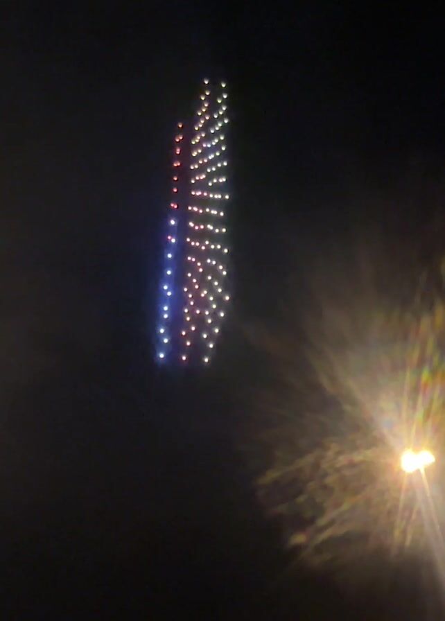 Here is a forensic description of the video: The video shows a crowd gathered at night in front of a building that appears to be a church. Most people in the crowd are holding candles. In the first seconds of the video, lights arranged in a rectangular formation are visible in the sky above the crowd. These lights are red, white, and blue. The camera then moves to focus on the crowd and the church building. The church building is lit up and appears to be made of stone. Some people are standing on an elevated platform in front of the church. A street lamp shines brightly to the right of the rectangular formation of lights in the sky.