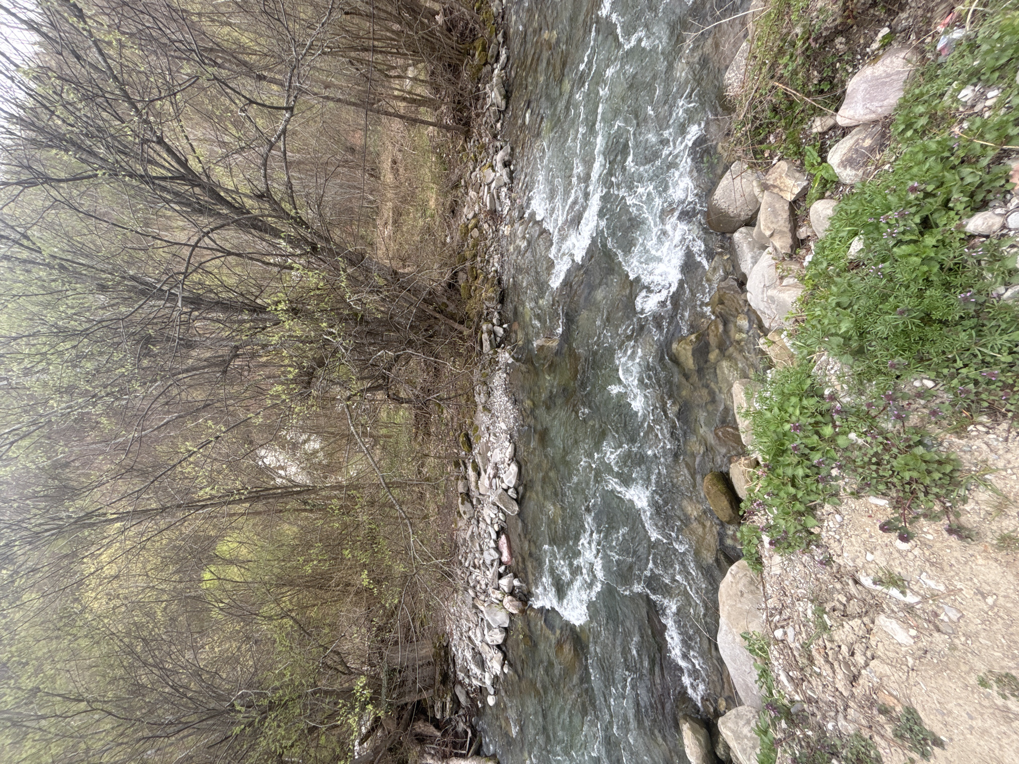 stream in Cherni Osam, Bulgaria. The stream flows from left to right with white water rapids. The banks are lined with rocks and vegetation on the right side of the image. Bare trees are present on the left bank.